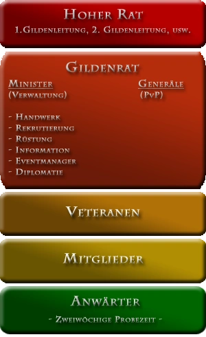 Eine Gilde will natürlich auch verwaltet werden. Hierfür greifen wir auf ein bei uns schon lange bewährtes System zurück, welches in 5 Rangebenen gestaffelt ist (siehe untere Grafik). Dieses System erlaubt, neben der leitenden Hand von oben, unseren Mitgliedern aktiv an der weiteren Gestaltung und dem Erfolg unserer Gemeinschaft mitzuwirken. Aber auch die "nicht-Berufs-Zocker" haben Gelegenheit, sich in einer stabilen und gut funktionierenden Gemeinschaft zu etablieren.